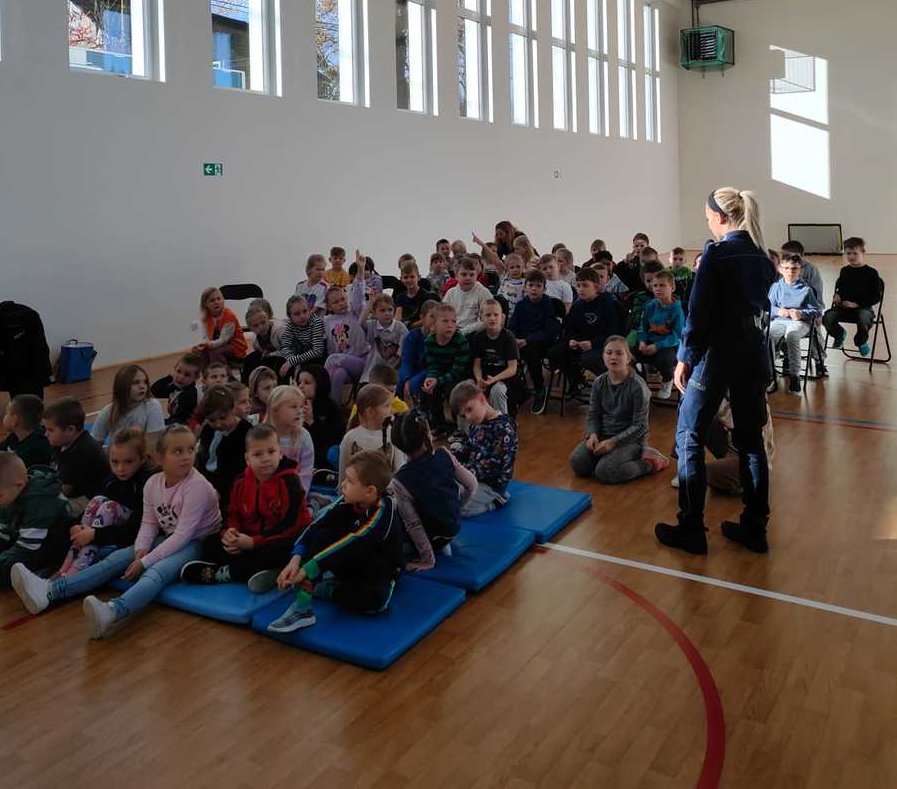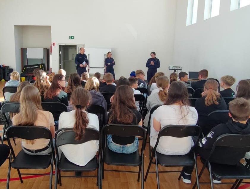 Starszym uczniom z klas 4–8 funkcjonariusze przedstawili tematykę związaną z przemocą rówieśniczą, hejtem w sieci, uzależnieniami oraz odpowiedzialnością prawną nieletnich. Młodzież dowiedziała się, jakie mogą być konsekwencje niewłaściwych zachowań oraz w jaki sposób reagować, gdy stają się świadkami agresji lub przemocy w swoim otoczeniu.