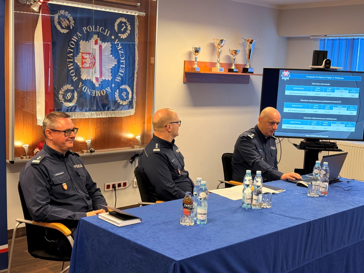 W siedzibie Komendy Powiatowej Policji w Wieliczce odbyła się narada roczna podsumowująca stan realizacji zadań w 2025 roku. W spotkaniu uczestniczył Zastępca Komendanta Wojewódzkiego Policji w Krakowie insp. Paweł Krauz, Zastępca Komendanta Powiatowego Policji w Wieliczce mł. insp. Paweł Ślęczkowski, przedstawiciele władz samorządowych powiatu i gmin, Prokuratury Rejonowej w Wieliczce, Zastępca Komendanta PSP w Wieliczce oraz funkcjonariusze i pracownicy cywilni wielickiej jednostki.